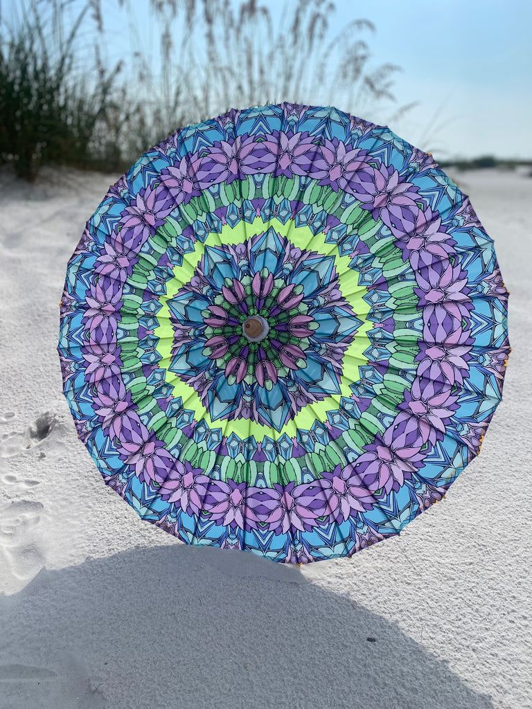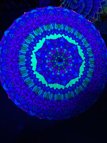 Brighten up your festival adventures and stay cool in the sun with our Crystal Cactus Bamboo Parasol – a one-of-a-kind accessory with vibrant functionality. This UV-reactive, blacklight fluorescent parasol is perfect addition to your festival gear, beach days, or outdoor events.