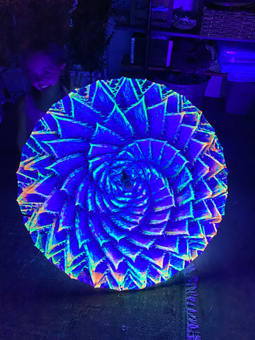 Brighten up your festival adventures and stay cool in the sun with our Succulent Bamboo Parasol designed by artist Justin Chamberlain. A-one-of-a-kind accessory with vibrant functionality. This UV-reactive, blacklight fluorescent parasol is perfect addition to your festival gear, beach days, or outdoor events.
