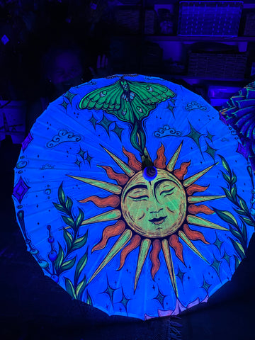 Brighten up your festival adventures and stay cool in the sun with our Sun And Luna Moth Bamboo Parasol hand drawn by artist Melanie Bodnar! A one-of-a-kind accessory with vibrant functionality. This UV-reactive, blacklight fluorescent parasol is perfect addition to your festival gear, beach days, or outdoor events.
